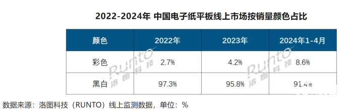 6月3号消息,根据洛图科技最新数据,电子纸平板在2024年迎来了彩色时代。2024年1至4月,黑白屏的电子纸平板销量占比达到了91.4%。但从趋势上来看,彩色屏产品的渗透正在逐年递增。2022年,彩色屏的占比仅为2.7%,2023年提升至了4.2%,2024年前四个月的表现翻倍为8.6%。彩色电子纸平板逐步成为了更加贴近消费者、性价比更高的产品。