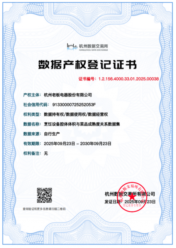 2025年9月,厨电行业迎来历史性突破——老板电器密集斩获三大重量级数据领域荣誉:率先拿下厨电行业首个数据持有权、使用权、经营权“三权合一”的产权登记证书,成功入选浙江省第一批高质量数据集典型案例,成为全国首批高质量数据集建设先行先试项目中唯一的厨电企业。