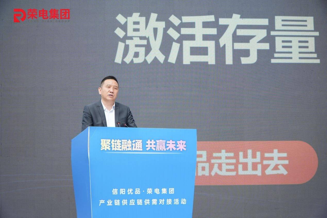4月27日,信阳优品·荣电集团产业链供应链供需对接活动在荣电集团(信阳)3U生态产业园举行。市委书记张宏伟,市委副书记、代市长卢希望出席启动仪式。省国资委党委委员、副主任李照松,市领导于海忠、李新伟以及荣电集团执行董事侯爱明参加。