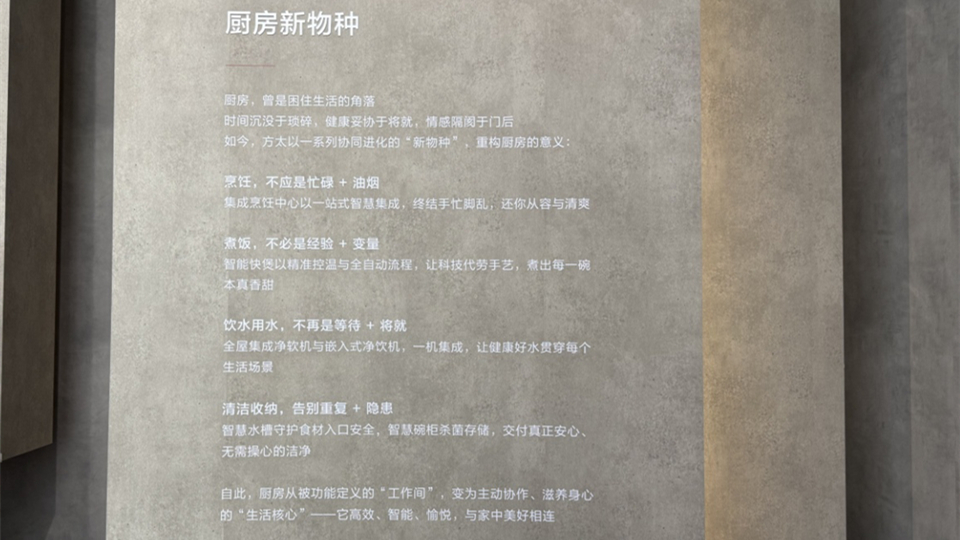 方太始终以用户需求为核心,依托行业独有的LivingLab用户真实生活实验室及中国厨房大数据体系,精准捕捉千万家庭烹饪场景的隐性痛点。此次展会,方太跳出单一厨电功能创新,实现了从场景整合到价值重构的智慧升维,将智慧厨房定义为覆盖饮食管理、保鲜存储、洗切沥配、排烟烹饪、清洁收纳、生态服务的六位一体全场景解决方案,直指安全可靠、高效便捷、绿色低碳、健康美味、舒适愉悦五大核心价值,为幸福厨居生活树立了全新行业范式。不止于产品与技术创新,方太还以开放姿态构建起完善的生态服务体系。此次展会中,方太展示了与30余家生态伙伴的深度协同成果,在健康管理领域,与鱼跃医疗、云诊科技等联手打造家庭健康管理中心,打通健康检测与饮食干预的链路;在空间协同领域,与头部地产商合作将智慧厨房前置植入高端住宅;在人机交互与场景延伸上,与Rokid探索无界交互,并布局“人车家”生态,让智慧厨居的价值边界不断延伸。[详细]